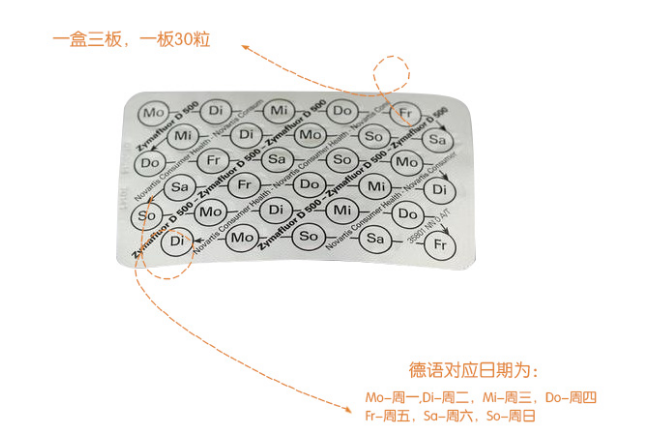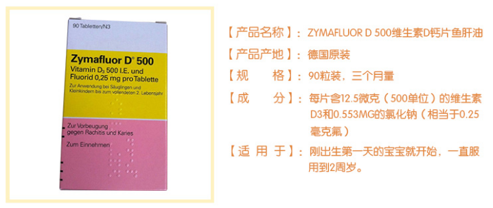 有效预防小儿佝偻病(软骨病)及龋齿,无任何副作用 ○ 提高肌体对钙、磷的吸收,使血浆钙和血浆磷的水平达到饱和程度 ○ 促进生长和骨骼钙化,促进牙齿健全。通过肠壁增加磷的吸收,并通过肾小管增加磷的再吸收。维持血液中柠檬酸盐的正常水平,防止氨基酸通过肾脏损失本品德国政府规定每个德国宝宝从出生到2岁期间必吃,在德国,如果没吃该款产品而得佝偻病或龋齿的宝宝,保险是不予赔付的。Zymafluor D500主要成分是维生素D3和氟。其中,维生素D3会对宝宝的骨、小肠和肾三种器官产生作用,帮助宝宝更好的吸收钙质,健康成长。含成份氟,氟对宝宝的牙齿好,尤其是长牙期的宝宝,亦可健齿。