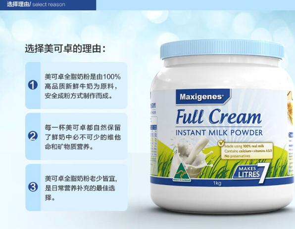 这是一款全家都适用的奶粉。2岁以上宝宝,小学生,孕妇妈妈,我们,长辈们,都适用这款奶粉,有糖尿病的人群也可以放心适用,提高,身体才能强健起来!美可卓全脂牛奶由高品质的新鲜牛奶以一种先进的工艺制作而成。只需添加水就可以创造出一杯奶香四溢、美味又营养的牛奶。每一杯都自然保留了新鲜牛奶重必不可少的维他命和矿物质,如钙、维生素A和D。搭配红印黑糖同时服用,女生可补气养颜补钙哦!