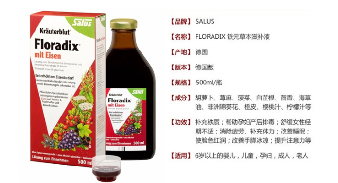 德国铁元Floradix产品功能:气血双补,补气养血。含有24种天然有机物质;解决女人月经不调问题;改善宝宝厌食问题;,提高学习效率;孕妇贫血。一瓶装,1-5岁儿童每次5毫升,每日一次。6-12岁儿童每次10毫升,每日一次。成人(孕妇)每次10毫升,每日两次。建议餐前饮用。
