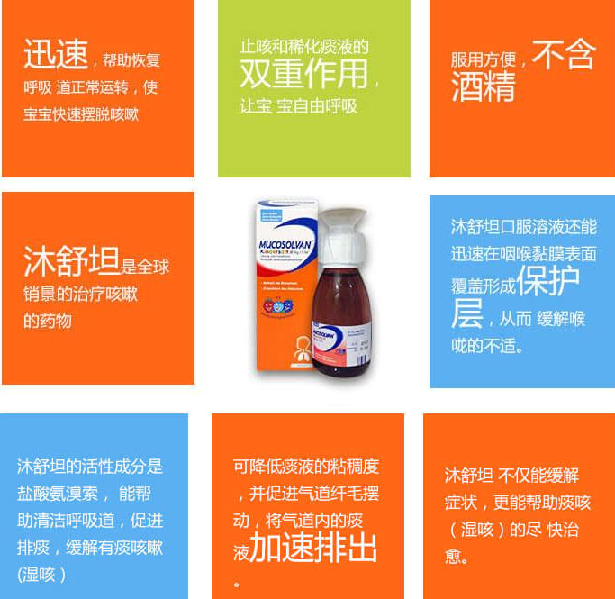 化痰止咳果味糖浆!起效迅速,帮助恢复呼吸道正常运转,使快速摆脱咳嗽。活性成分是盐酸氨溴索,能帮助清洁呼吸道,促进排痰,缓解有痰咳嗽 (湿咳),有助于控制感染。更确切的说,沐舒坦可降低痰液的粘稠度,并促进气道纤毛摆动,将气道内的痰液加速排出。德国版本小绿叶。专门针对婴幼儿的糖浆,植物精华提取,不含酒精,有效快速的缓解感冒等各种病因引起的咳嗽。6岁以下婴幼儿: 一次2.5ml, 一天多服用5ml;6-12周岁儿童: 一次5ml, 一天多 10ml;12周岁以上儿童以及成人: 一次5ml, 一天多服用15ml。宝宝专用的化痰止咳果味糖浆!起效迅速,帮助恢复呼吸道正常运转,使宝宝快速摆脱咳嗽。活性成分是盐酸氨溴索,能帮助清洁呼吸道,促进排痰,缓解有痰咳嗽 (湿咳),有助于控制感染。更确切的说,沐舒坦可降低痰液的粘稠度,并促进气道纤毛摆动,将气道内的痰液加速排出。