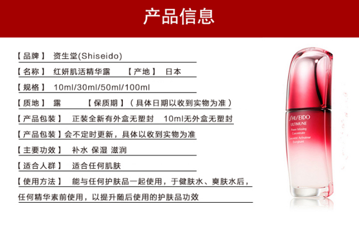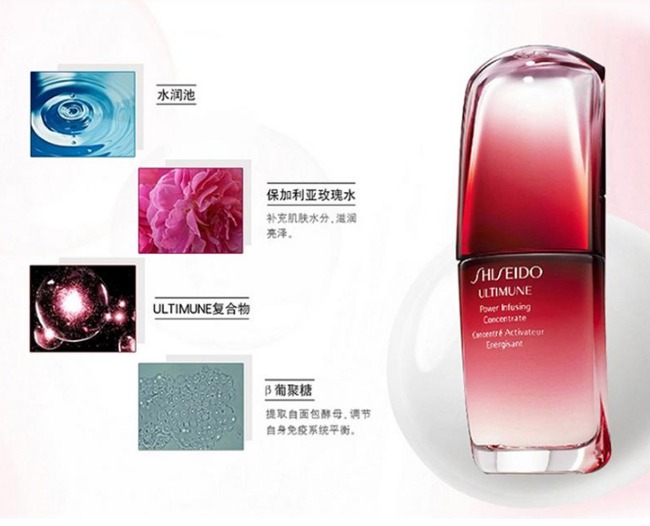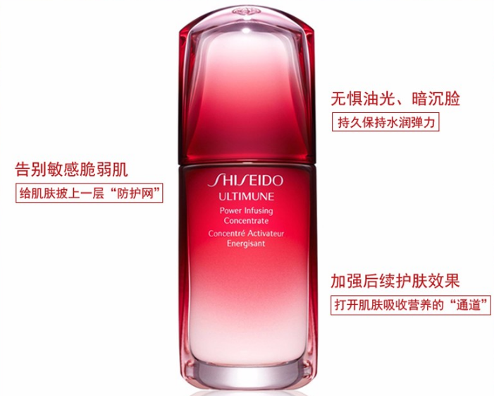 Shiseido 资生堂红妍肌活浓缩精华露让您拥有健康亮丽的肤色。 这款质地细腻的浓缩精华液适合所有类型的肌肤和所有年龄段的人群,它可被肌肤快速吸收,抚平细纹和皱纹,让肌肤看起来更紧致。 让肌肤恢复青春活力,因此您会感觉肌肤更柔软丰盈,更有光泽。 本品采用独创技术,结合银杏、日本紫苏和百里香的纯植物混合物,可有效增强肌肤的自然,改善肤质和肤色。 其 Ultimune Complex™ 针对朗格汉斯细胞而设计,朗格汉斯细胞在预防细胞衰老、抵御环境侵害因素损伤和因情绪紧张而引起的肌肤衰老方面起重要的作用,具有强健和肌肤的功效。
