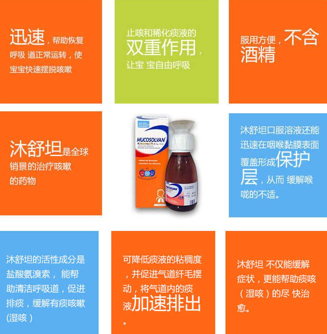 化痰止咳果味糖浆!起效迅速,帮助恢复呼吸道正常运转,使快速摆脱咳嗽。活性成分是盐酸氨溴索,能帮助清洁呼吸道,促进排痰,缓解有痰咳嗽 (湿咳),有助于控制感染。更确切的说,沐舒坦可降低痰液的粘稠度,并促进气道纤毛摆动,将气道内的痰液加速排出。德国版本小绿叶。专门针对婴幼儿的糖浆,植物精华提取,不含酒精,有效快速的缓解感冒等各种病因引起的咳嗽。6岁以下婴幼儿: 一次2.5ml, 一天多服用5ml;6-12周岁儿童: 一次5ml, 一天多 10ml;12周岁以上儿童以及成人: 一次5ml, 一天多服用15ml。宝宝专用的化痰止咳果味糖浆!起效迅速,帮助恢复呼吸道正常运转,使宝宝快速摆脱咳嗽。活性成分是盐酸氨溴索,能帮助清洁呼吸道,促进排痰,缓解有痰咳嗽 (湿咳),有助于控制感染。更确切的说,沐舒坦可降低痰液的粘稠度,并促进气道纤毛摆动,将气道内的痰液加速排出。