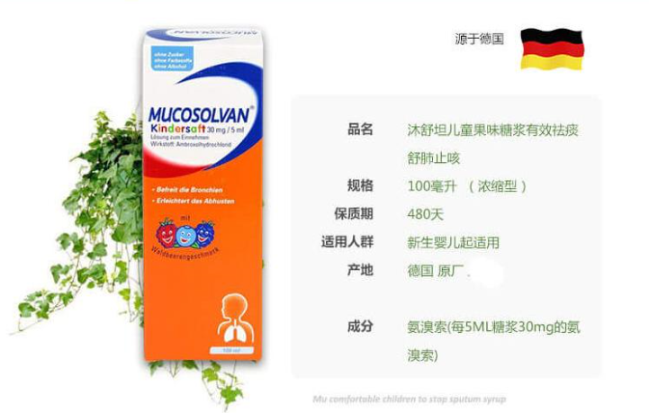 化痰止咳果味糖浆!起效迅速,帮助恢复呼吸道正常运转,使快速摆脱咳嗽。活性成分是盐酸氨溴索,能帮助清洁呼吸道,促进排痰,缓解有痰咳嗽 (湿咳),有助于控制感染。更确切的说,沐舒坦可降低痰液的粘稠度,并促进气道纤毛摆动,将气道内的痰液加速排出。德国版本小绿叶。专门针对婴幼儿的糖浆,植物精华提取,不含酒精,有效快速的缓解感冒等各种病因引起的咳嗽。6岁以下婴幼儿: 一次2.5ml, 一天多服用5ml;6-12周岁儿童: 一次5ml, 一天多 10ml;12周岁以上儿童以及成人: 一次5ml, 一天多服用15ml。宝宝专用的化痰止咳果味糖浆!起效迅速,帮助恢复呼吸道正常运转,使宝宝快速摆脱咳嗽。活性成分是盐酸氨溴索,能帮助清洁呼吸道,促进排痰,缓解有痰咳嗽 (湿咳),有助于控制感染。更确切的说,沐舒坦可降低痰液的粘稠度,并促进气道纤毛摆动,将气道内的痰液加速排出。