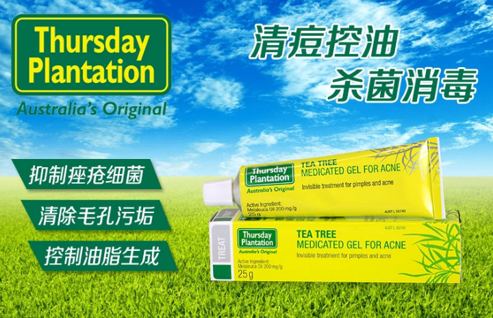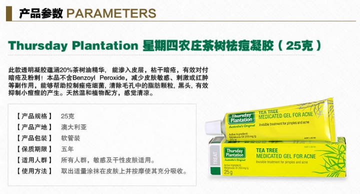 Thursday Plantation 星期四农庄 茶树祛痘凝胶能渗入皮层,枯干暗疮,对暗疮、粉刺、黑头、白头等有改善作用;神奇的茶树油精华具有再生及舒缓的功效,具有、收敛、滋润的疗效,可使创伤、切伤、蚊虫、叮咬、瘀青或湿疹、皮炎,青春痘等早日愈合;可,防止痘痘感染留疤;控制, 毛孔中的脂肪颗粒、 黑头、有效抑制小痘痘的产生;天然温和植物配方使用感凉爽、不粘腻、止痒效果一流;不含对氧化苯甲酰,可减少皮肤敏感、刺激或等副作用;透明凝胶质地,不影响你的面部美观,于无形中给你带来体贴的呵护。