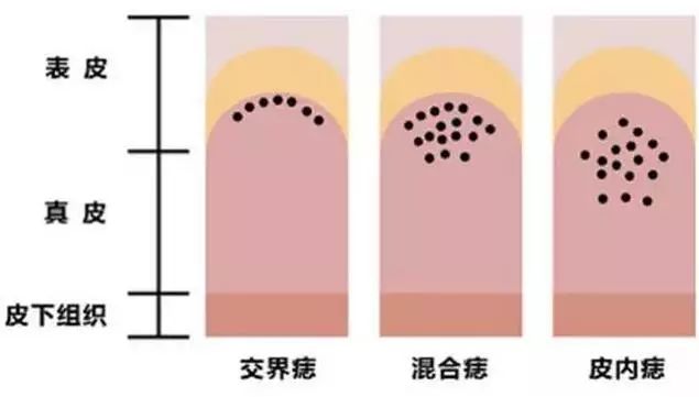 色素痣按痣细胞痣细胞在皮肤内分布位置的不同,可分为三类:交界痣、混合痣和皮内痣。