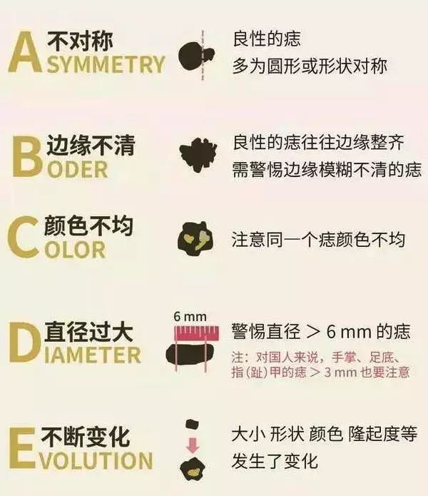 一般来说,色素痣都是良性的,但不排除有恶变的可能,所以我们自己可以通过「ABCDE法」用肉眼观察是否有恶变的征兆,觉得可疑的时候直接去医院进行病理检测。