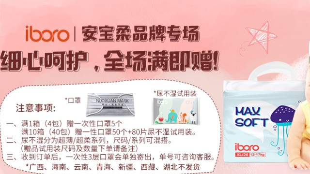活动赠送方式: 1、满一箱(4包)尿布送同品牌一次性3层口罩5个;满十箱(40包)送同品牌一次性3层口罩50个+80片 尿布试用装。 2、尿布分为超薄/超柔系列,购买十箱的客户,尺码/系列可以混搭(赠品试用装尺码及数量下单时请备注) 3、收到订单后,一次性3层口罩会单独寄出,单号可留言咨询客服