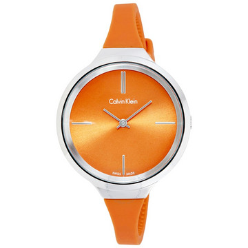 这款 Calvin Klein 卡尔文·克莱恩 Lively 系列 K4U231YM 女士时尚腕表 ,明亮欢快的橘色,细长的硅胶表带,搭配 34mm 的极简风浅蓝色圆形表盘,非常精致优雅的设计。采用瑞士石英机芯,8mm厚度,30m日常防水。夏天搭配服装真的超美。