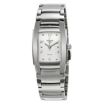 这款 Tissot 天梭 T10 系列 T073.310.11.017.00 女式时装腕表,搭载 ETA Caliber F03.111 瑞士石英机芯,银色矩形不锈钢表壳,31.20 mm x 25.40 mm的尺寸,适合女生佩戴;银色表盘,阿拉伯数字和铆钉型的时标,三指针设计;搭配银色不锈钢表链。
