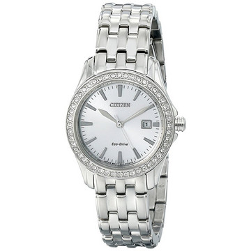 CITIZEN 西铁城 光动能女士腕表 EW1901-58A,采用银色的不锈钢表壳和表带,施华洛世奇水晶表圈,光动能机芯,无需担心更换电池,充满电后可达3个月续航,简洁表盘设计,蓝宝石表镜,防水100米。