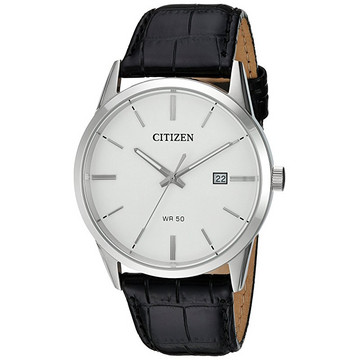 Citizen BI5000-01A 男士经典手表采用黑色皮革表带加银色不锈钢表壳,白色表盘异常简洁,采用一颗日本石英机芯,保证走时精准。表盘直径39mm,防水30米。这款手表外观彰显简约大气之美,低调中带有奢华感,无论商务或者休闲场合都非常适合佩戴。