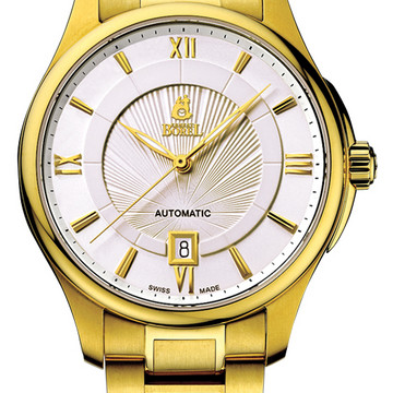 品牌:依波路;系列:机械——布拉克系列;款式:男表;机芯:自动机械机芯;表壳:不锈钢 PVD镀金;表盘尺寸:40mm;表冠:普通;表底:透底;表镜:蓝宝石水晶玻璃;表盘:白色;表带:不锈钢 PVD镀金;表带颜色:金色;表扣:折叠扣;防水:50米;功能:大三针 日期显示;