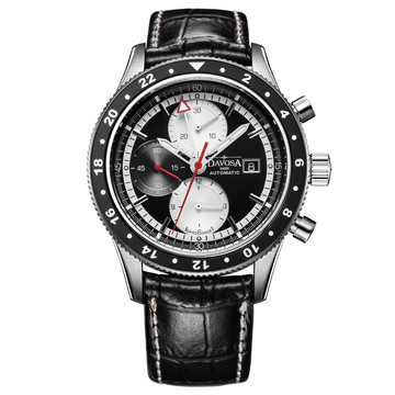 精致典雅时尚个性表款,选取44毫米大直径表盘设计,黑色经典底纹搭配黑色真皮表带,彰显高贵优雅的气质,沉稳不凡永恒典雅的设计。表盘内设有计时码表,日历显示功能,配以三表冠,外观时尚功能强大,可以准确调控时间。整体表款总体呈现出一种巧妙完美结合的风范,让你能够时刻保持优雅真性情,做时尚搭配不凡气质男士。品牌:迪沃斯;系列:Innovation 杰作系列;款式:男表;机芯:自动机械机芯;机芯型号:DAVOSA手工机精致雕花镀铑VJ-7754计时码表GMT机芯;表壳:不锈钢;表盘尺寸:44mm;厚度:15.7mm;表冠:计时三表冠;表底:透底;表镜:蓝宝石水晶玻璃;表盘:黑色;表带:牛皮;表带颜色:黑色;表扣:针扣;防水:50米;功能:日期显示 计时码表 夜光;推出年份:2012年;