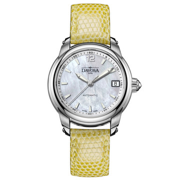 Colour Delight Automatic 蜥蜴皮DAVOSA精致细腻的Ladies Delight系列真钻女腕表~DAVOSA(迪沃斯)专为钟表收藏女士们推出全新自动上炼腕表除了可见白色珍珠母贝表面外,并搭配强大夜光指针及指示反面还可见到纯蓝钢螺丝,可完全欣赏DAVOSA精致细腻的制表艺术全只采用瑞士顶级316L环保不锈钢实心材质表壳粉彩色系的100%蜥蜴皮表带搭载ETA-2824-2机芯,完全以手工精致雕花并镀铑处理品牌:迪沃斯;系列:Diva 女主角系列;款式:女表;机芯:自动上链机械机芯;机芯型号:ETA 2824-2;表壳:不锈钢;表耳:16mm;表盘尺寸:34mm;厚度:10.8mm;表冠:普通;表底:透底;表镜:蓝宝石水晶玻璃;表盘:白色深海珍珠母贝;表带:蜥蜴皮;表带颜色:黄色;表扣:针扣;防水:100米;功能:日期显示 大三针 夜光;推出年份:2012年;