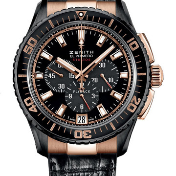 品牌:真力时;系列:ELPRIMERO系列;款式:男表;机芯:自动机械机芯;表壳:玫瑰金 钛;表冠:普通;表底:透底;表镜:蓝宝石水晶玻璃;表盘:黑色;表带:鳄鱼皮;表带颜色:黑色;表扣:折叠扣;防水:100米;功能:小三针 日期显示 计时码表 飞返;