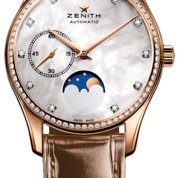 品牌:真力时;系列:HERITAGE系列;款式:女表;机芯:自动机械机芯;机芯型号:Elite 692型;表壳:玫瑰金 镶钻;表盘尺寸:33mm;厚度:8.65mm;表冠:普通;表底:透底;表镜:蓝宝石水晶玻璃;表盘:白色 珍珠母贝 镶钻;表带:鳄鱼皮;表带颜色:棕色;表扣:针扣;防水:30米;功能:小三针 月相显示 镶钻;