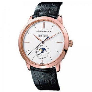 品牌:芝柏;系列:GP 1966系列;款式:男表;机芯:自动机械;机芯型号:Cal.GP033M0自动机芯;表壳:18K玫瑰金;表盘尺寸:40mm;表镜:蓝宝石水晶玻璃;表盘:白色表盘;表带:皮带(鳄鱼皮);防水:30米;功能:历象(时间指示、全日历(日期、星期、月份)及月相功能);