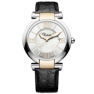 品牌:萧邦;系列:其它系列;款式:女表;机芯:自动机械机芯;机芯型号:Chopard 01.01-C;表壳:精钢;表盘尺寸:40mm;表底:透底;表盘:银色 中央为珍珠母贝;表带:鳄鱼皮;表带颜色:黑色;表扣:针扣;防水:50米;功能:日期显示;
