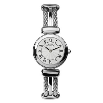 赫柏林-Cables系列 17420/B08 女士石英表 最大的亮点在于腕带的设计,以不锈钢为主构,于表壳连接处制缆绳设计,清新独特。双针简洁设计,在银色简洁表盘上设计者选用的是罗马数字刻度,典雅风格,圆润表身的独特气质越发突显。经典瑞士石英机芯与蓝宝石水晶玻璃镜面的完美融合都是你不可多得的好选择。此款赋予女士自信、优雅的风采,是时尚都市女士的最佳选择。品牌:赫柏林;系列:其它系列;款式:女表;机芯:瑞士石英机芯;表壳:316L不锈钢;表盘尺寸:22.5mm;厚度:5.5mm;表冠:普通;表底:不透底;表镜:防反光宝石水晶玻璃镜面;表盘:银色;表带:316L不锈钢;表带颜色:银色;表扣:珠宝扣;防水:50米;功能:无其他特殊功能;推出年份:2012年;