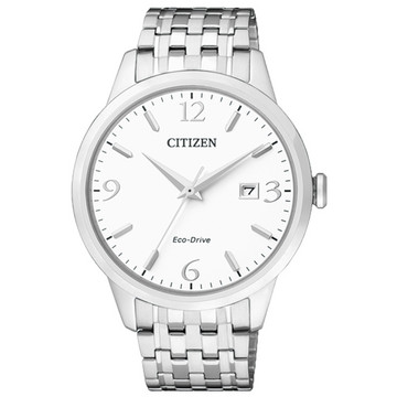 品牌:西铁城;系列:光动能男表系列;款式:男表;机芯:光动能机芯;表壳:不锈钢;表盘尺寸:40mm;厚度:9mm;表底:不透底;表镜:蓝宝石;表盘:白色;表带:不锈钢;表带颜色:银色;表扣:折叠扣;防水:50米;功能:日期显示 大三针;