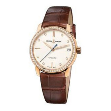 品牌:雅典;系列:鎏金系列;款式:女表;机芯:自动上链机芯;表壳:18k玫瑰金镶钻;表盘尺寸:31mm;表镜:蓝宝石水晶玻璃;表盘:米黄色;表带:鳄鱼皮;表带颜色:深棕色;表扣:折叠扣;防水:50米;功能:日期显示 大三针;