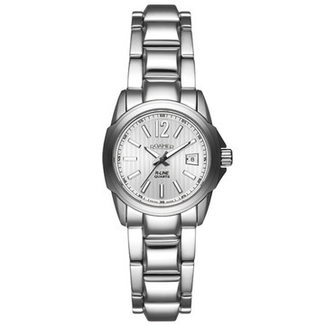 品牌:罗马;系列:R-line系列;款式:女表;机芯:石英机芯;表壳:不锈钢;表盘尺寸:32mm;厚度:10mm;表冠:旋入式表冠;表底:密底;表镜:人工合成蓝宝石表镜;表盘:银色;表带:不锈钢;表带颜色:银色;表扣:蝴蝶扣;防水:100米;功能:日期显示;
