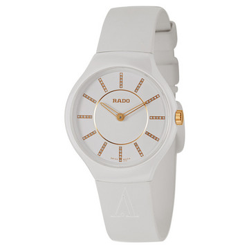 RADO雷达是国内知名度最高的高端瑞士腕表品牌之一,最早开始采用高科技材质制表。 这款True真薄系列女士石英腕表R27958709,卖点为只有4.9毫米的等离子电镀处理陶瓷表壳厚度,纯白色高科技陶瓷表壳。除此之外,瑞士石英机芯(电池供电),白色表盘搭配搭配玫瑰金色指针及时标,60颗白钻点缀其中,总重量达到0.038克拉,蓝宝石防刮防眩目水晶表镜。防水系数达30米,表径30毫米。