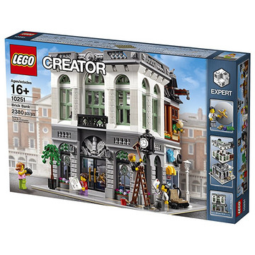 LEGO乐高积木银行,属于大热收藏级的街景系列,货号为10251,2016年发售的新品,内含2380个颗粒,5个公仔,两层结构,延续了乐高三年一转角的传统。内部细节也很丰富。