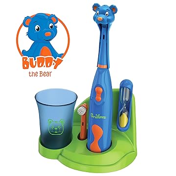 美国亚马逊 Brusheez Children's Electronic Toothbrush Set – Includes Battery-Powered Toothbrush, 2 Brush Heads, Cute Animal Head Cover, 2-Minute STimer, Rinse Cup, Storage Base - Buddy the Bear: Beauty_海淘网