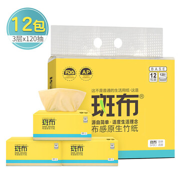 【京东商城】 【斑布抽纸】斑布 (BABO) 本色抽纸 无漂白竹浆 BASE系列3层120抽12包装(小规格) 3层120抽12包-S