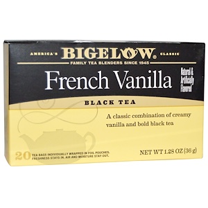 美国经典, 家茶调制商,始于 1945 年, 天然&人工香料 , 茶包独立装于铝箔袋中, 保持新鲜度。隔离空气和水分。, 犹太洁食,奶油香草和刚劲红茶的经典搭配。 Bigelow 混合红茶法国香草 我们为我们的配方而自豪香草的奶油风味与活力红茶形成经典搭配。它是精致的,它是令人纵享的,它是美味的,加一点牛奶和甜料,就成为一杯完美饮品。 释放新鲜…………这是关键我们使用特别的铝箔袋保护您的茶免受空气、水分以及周围气味的侵袭。那么打开包装并享用无与伦比的风味——新鲜——您所到之处皆有 Bi