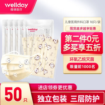 京东商城 维德医疗(WELLDAY)一次性儿童医用外科口罩挂耳式三层无菌级防细菌飞沫轻薄透气防护口罩10只/袋 【单片独立包装灭菌级50只】小黄狗【图片 价格 品牌 评论】-京东_海淘网