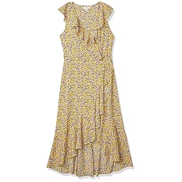 【美国亚马逊】 Max Studio Women's Printed Ruffle Wrap Midi Dress, Sunshine/Taupe/Lilac, Extra Small at Amazon Women’s Clothing store
