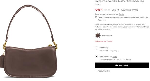 Nordstrom这款Coach蔻驰SWINGER纯色腋下包,售价降至$206.25,美国境内免邮,转运到手约1491元;