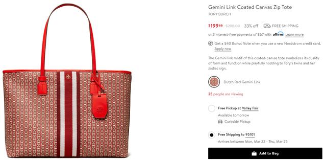 nordstrom的这款Tory Burch 汤丽柏琦Gemini Link系列印花托特包补货,售价67折$199.66;