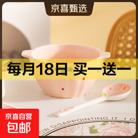 少女心草莓双耳碗勺加厚汤碗沙拉碗饭碗家用碗高颜值釉下彩餐具 浅粉草莓双耳碗(1碗1勺) 2件套