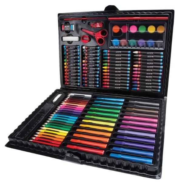 ALEX儿童玩具于1986年始创于美国,多年来, ALEX 的许多产品都曾获得了知名媒体以及玩具专业审评机构的荣誉和奖项。这款ALEX Toys 便携式美术手提箱,拥有多达150件相关工具,种类齐全,包含了印章、彩色铅笔、蜡笔、水彩笔、水粉颜料、橡皮、尺子等等,颜料均采用材料制成,可靠。拥有一个带提手的收纳塑料箱,方便携带。
