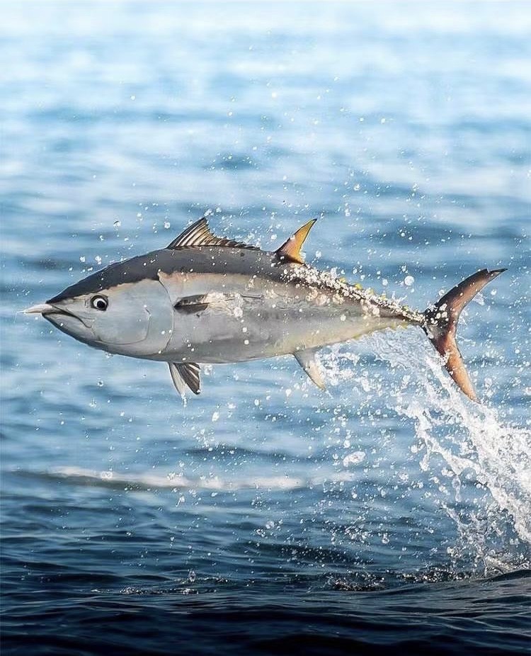 金枪鱼是出名的游泳健将,它细长的纺锤形身体很适合在海洋中穿梭,古希腊人称金枪鱼thynō,这意味着“冲”,就像它游泳时的速度,可达70公里,每天成群结队的巡游170公里