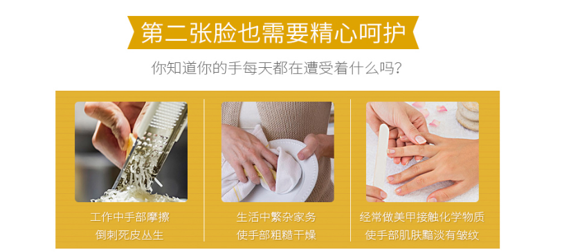 此款手膜针对各种手掌干裂、过敏、重体力劳动导致手部粗糙、家务装修等频繁与化学物品接触造成的手部皮肤粗糙,对于等引起的湿疹也有显著效果。味道比较独特~