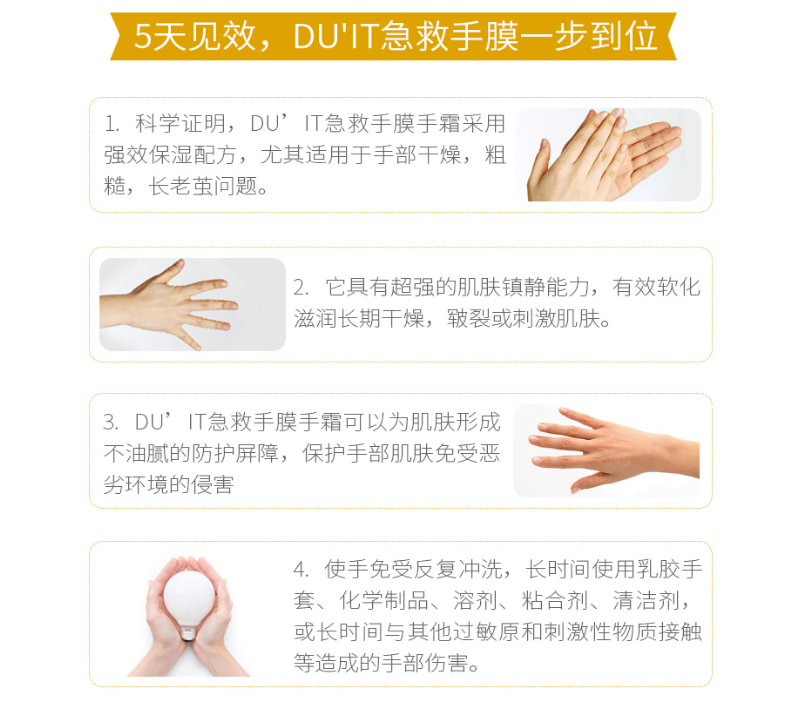 DU'IT急救手膜护手霜是澳洲品牌急救手膜,不仅可以滋润手部肌肤可手部粗燥肌肤,同时具有,滋润的功效。