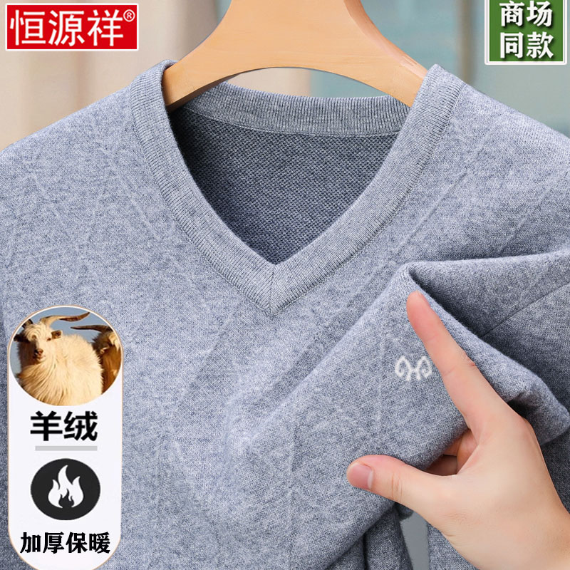 恒源祥鸡心领羊绒衫V领老年毛衣