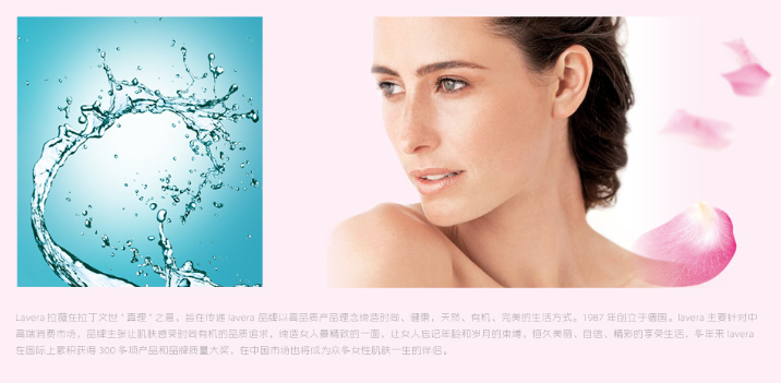 Lavera拉薇在拉丁文世“真理”之意,旨在传递lavera 品牌以高品质产品理念缔造时尚、健康,天然、有机、完美的生活方式。1987年创立于德国。lavera主要针对中高端消费市场,品牌主张让肌肤感受时尚有机的品质追求,缔造女人精致的一面,让女人忘记年龄和岁月的束缚,恒久美丽、自信、精彩的享受生活,多年来lavera在国际上累积获得300多项产品和品牌质量大奖,在中国市场也将成为众多女性肌肤一生的伴侣。