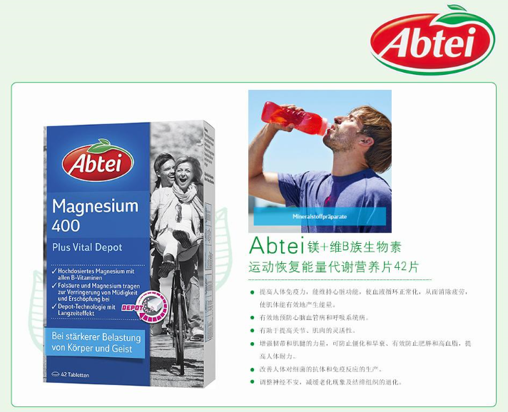 德国直邮 Abtei 爱普泰 镁+维B族生物素 运动恢复能量代谢营养片 42片低至44.85元