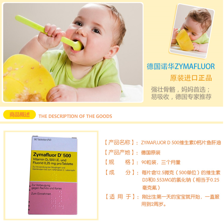 维持血液中柠檬酸盐的正常水平,防止氨基酸通过肾脏损失本品德国政府规定每个德国宝宝从出生到2岁期间必吃,在德国,如果没吃该款产品而得佝偻病或龋齿的宝宝,保险是不予赔付的。Zymafluor D500主要成分是维生素D3和氟。其中,维生素D3会对宝宝的骨、小肠和肾三种器官产生作用,帮助宝宝更好的吸收钙质,健康成长。含成份氟,氟对宝宝的牙齿好,尤其是长牙期的宝宝,亦可健齿。