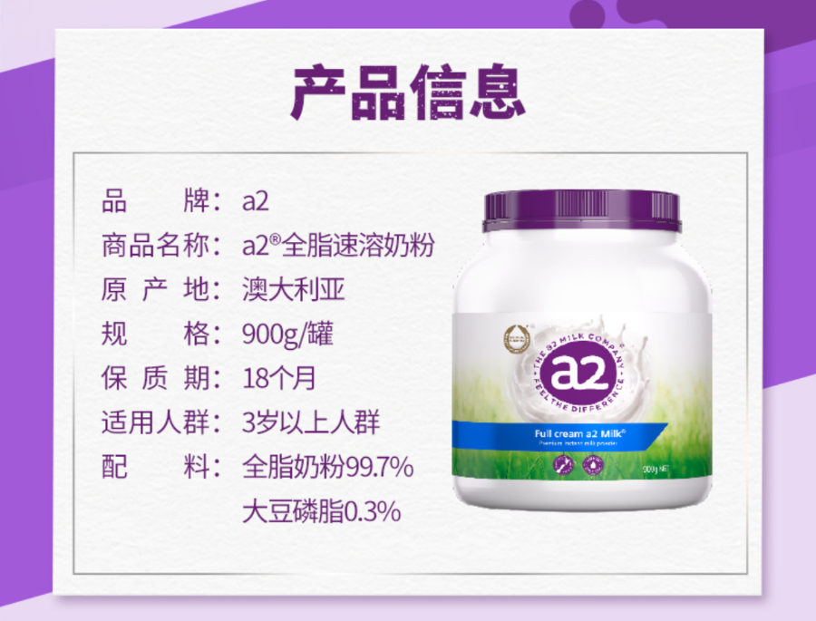 澳洲A2 全脂高钙高蛋白儿童学生成人奶粉紫吨吨900g*2罐
