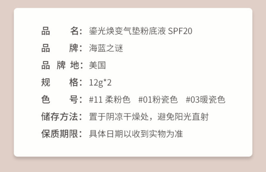 美国 LA MER/海蓝之谜 鎏光焕变气垫粉底液 SPF20 ROSE IVORY 12G*2 11#(一壳两芯)
